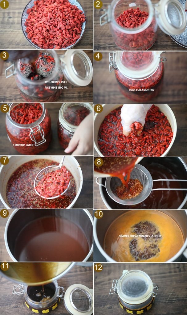 Pour the wolfberry and wine into a bottle and soak for two months.