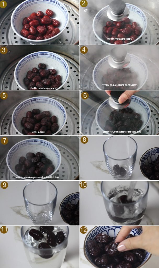 - Put them into a steamer, steam for three times, and cool to room temperature three times.