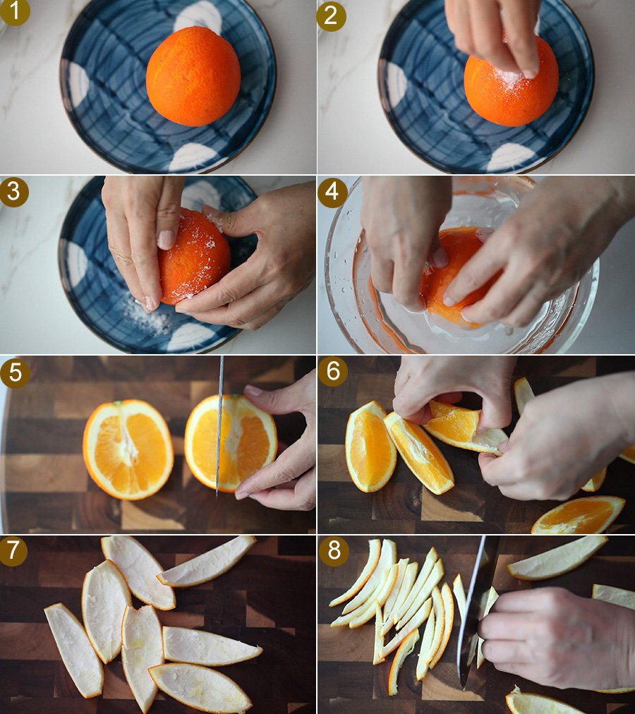 1. Prepare an orange and rub it with salt first to make the orange peel cleaner. Then rinse the orange with water. Cut the orange, leaving the orange peel, and cut it into long strips.