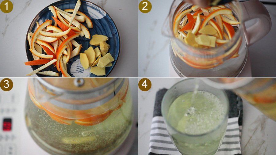 3. Put the ginger slices and orange peel into the health pot and boil for at least 20 minutes. Drink a cup when it is warm, three times a day.